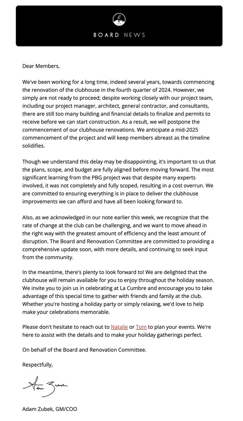 Dear La Cumbre Members, Next week, the Board will be meeting to tackle the important topic of how to fund our capital needs moving forward. As part of this due diligence, we had received an expression of interest regarding the purchase of the Club. To better understand the optionality, the Board has had additional conversations with other interested parties. The Board is actively engaged in long-range financial planning to ensure that we can sustain and elevate the Club for generations to come. As part of this process, we are exploring a wide range of funding options to support the significant capital investments our Club will need over the coming years. This includes traditional approaches like capital dues, transfer fees, assessments, and loans. In the spirit of good governance and due diligence, the Board is also gathering information about alternative funding avenues, including outside capital interest. To be clear: No decisions have been made No offers are under consideration The Board has not authorized any action toward selling the Club What has occurred are preliminary, exploratory conversations intended to fully understand what options may exist. This process is about building knowledge so that if we need to make major financial decisions in the future, we do so from a well-informed position, always with the best interest of the membership and the long-term health of the Club in mind. We understand that seeing outside individuals on the property may have raised questions, and we regret any confusion this may have caused. Our commitment remains: Transparency with our members Adherence to sound governance principles A deliberate, member-centered process We will continue to keep you informed as these discussions evolve. There will be no path forward on any major initiative without full Board consideration and member engagement. Thank you for your understanding and for your ongoing dedication to the La Cumbre community. Tracy Jenkins President, Board of Director sLa Cumbre Country Club